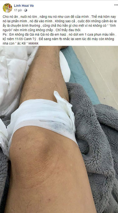 Câu chuyện lẽ ra sẽ gây nên nhiều nỗi lo lắng nhưng lại bắt đầu rẽ sang hướng hài hước khi Hoài Linh nhanh chóng tiết lộ "kẻ" đã ra vết thương cho anh, tất cả chỉ xuất phát từ...một con gà! "Em không đá Gà mà Gà nó đá em... Nó dứt em 1 cựa phun máu liền. Kỷ niệm 11/05 Canh Tý. Để sang năm facebook nhắc lại xem lúc đó mày còn không nha con 'ác kê'", nam danh hài chia sẻ.