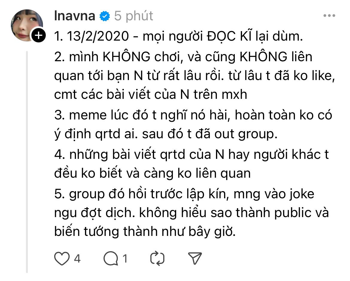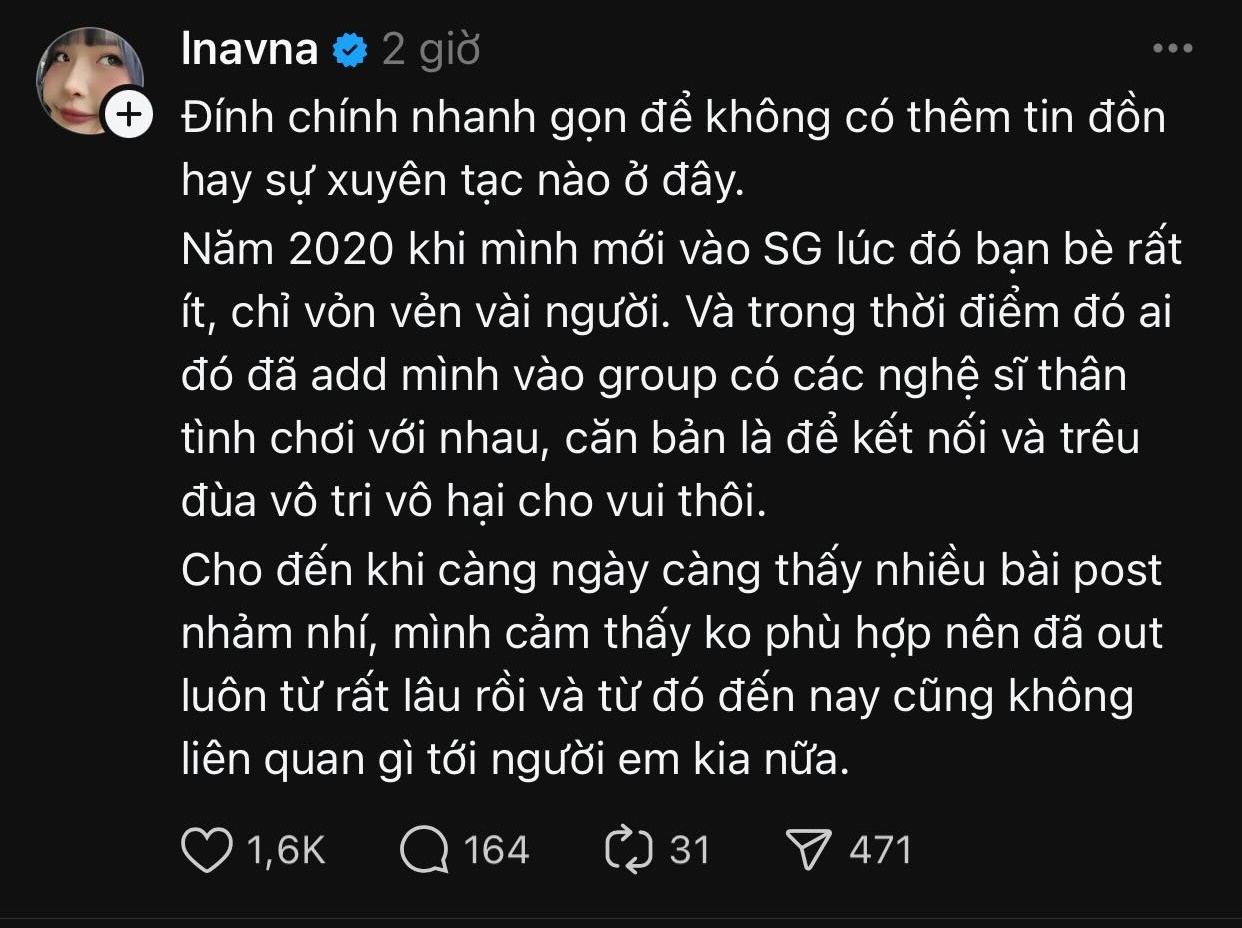 Ngoài ra, ca sĩ Lena - chủ hit Simple Love cũng đã lên tiếng làm rõ ồn ào này. Cô xác nhận được thêm vào nhómnăm 2020, thời điểm đó mới vào TP.HCM, không có nhiều bạn nên ở trong nhóm để đùa "vô tri". Đến khi nhận ra nhóm có nhiều bài đăng nhảm nhí, nội dung không phù hợp thì cô đã chủ động rời đi. Cô khẳng định nhóm đó trước kia là nhóm kín, chỉ được công khai vào đợt dịch 2020 và ngày càng biến tướng. Lena cho biết đã không tương tác mạng xã hội với Negav từ lâu.