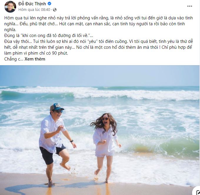 Đức Thịnh cho rằng sống bên một người không chỉ có ngọt ngào mà còn có cả "đắng cay", và anh là một ví dụ. Dù kiếm được rất nhiều tiền nhưng nam đạo diễn vẫn phải... "xin tiền ăn sáng và đổ xăng" từ vợ.