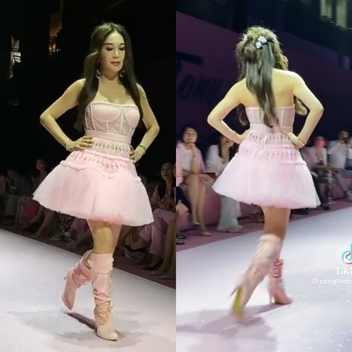 Vài ngày trước, Ôn Bích Hà bất ngờ xuất hiện catwalk trên một sàn diễn thời trang. Cô tự tin sải bước với bộ váy hồng bồng bềnh kết hợp cùng với đôi boot cao cổ.