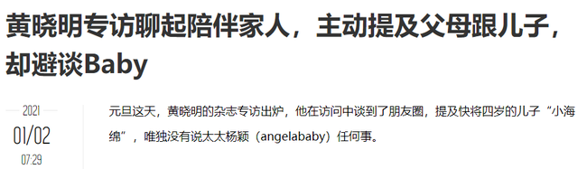Trang QQ ngày 2/1 đã dẫn nguồn bài phỏng vấn trên tạp chí vào đầu năm 2021 mới đây của Huỳnh Hiểu Minh. Trong cuộc phỏng vấn, anh ấy nói về bạn bè và cậu con trai Bọt Biển nhỏ sắp tròn 4 tuổi, nhưng lại tuyệt nhiên không nói gì về bà xã Angelababy.