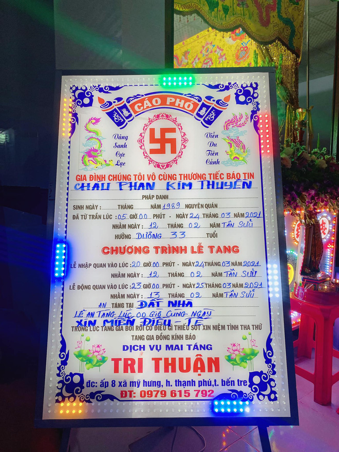 Được biết sau khi qua đời tại TP.HCM, người đẹp sinh năm 1989 đã được đưa về quê nhà Bến Tre để tổ chức tang lễ. Theo mong muốn của gia đình, lễ viếng của Phan Thuyền không nhận phúng điếu. Vào ngày 25/03, lễ an táng của cô sẽ được cử hành ngay tại khu đất của gia đình.