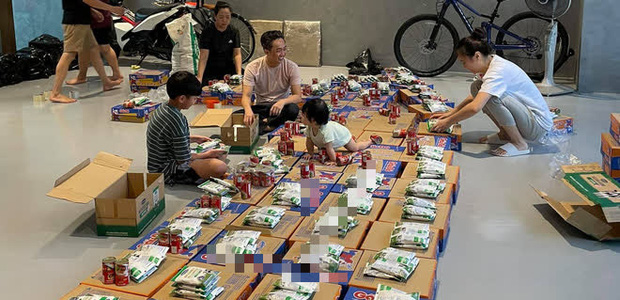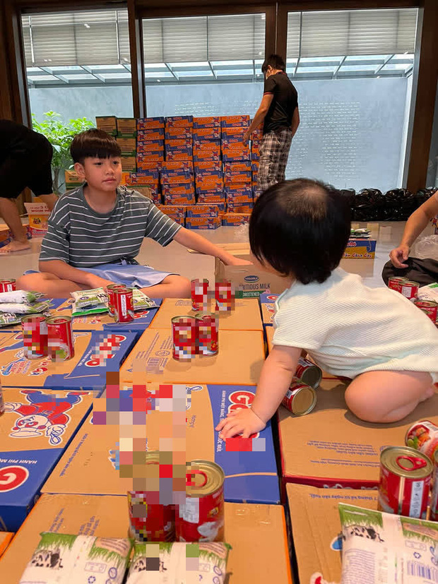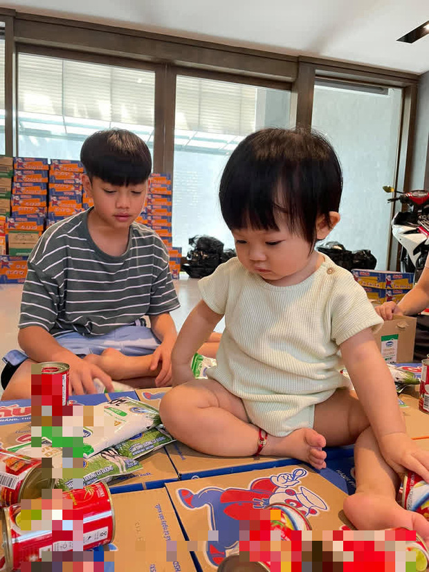 Vợ chồng Đàm Thu Trang và Cường Đô La cũng ra tay san sẻ khó khăn với người dân bằng những phần quà là sữa, cá hộp, mì gói,...Tuy nhiên, điều đáng chú ý là vợ chồng nam doanh nhân còn cho 2 con là Subeo và Suchin cùng tham gia hoạt động ý nghĩa này.
