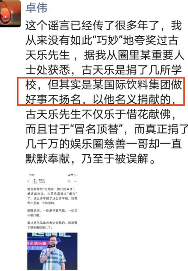 Trác Vỹ cho hay, Cổ Thiên Lạc đã quyên góp cho hoạt động từ thiện ở một số trường học, nhưng số tiền đem đi ủng hộ thực chất lại là của một tập đoàn thực phẩn quốc tế nào đó không muốn xướng danh nên đã mượn danh nghĩa của nam diễn viên để thực hiện hoạt động từ thiện mà thôi. Nói về vấn đề này, Trác Vỹ gay gắt chỉ trích Cổ Thiên Lạc là kẻ mạo danh, lấy tên tuổi của mình đi làm từ thiện chứ thực chất không hề bỏ ra một đồng nào.