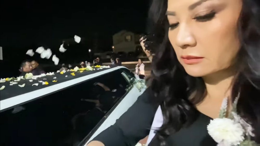 Sau lễ diễu hành, thắp nến và đọc kinh niệm Phật lần cuối, tro cốt Phi Nhung được đưa ra xe để về nơi an nghỉ cuối cùng. Lúc này, mọi người cùng cầm hoa hồng trắng tung lên xe để tiễn đưa nữ ca sĩ, nhìn rất đẹp và trang trọng.