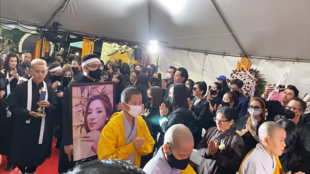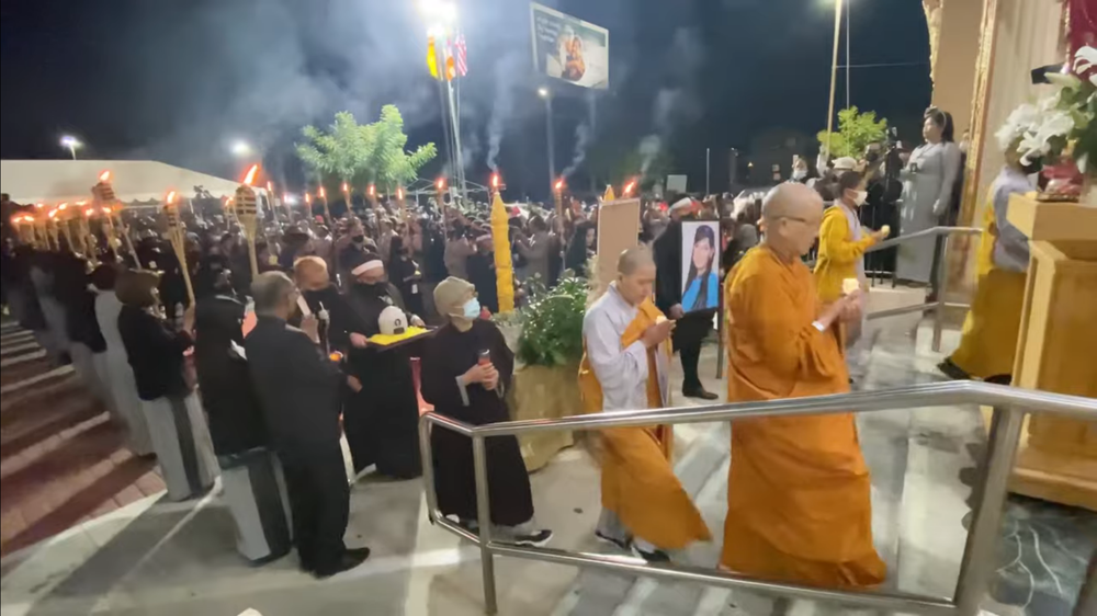 Cầm tro cốt Phi Nhung là con gái và di ảnh là các con cháu, cùng nữ ca sĩ Trizzie Phương Trinh. Mọi người cùng đốt đuốc để diễu hành dưới trời đêm.