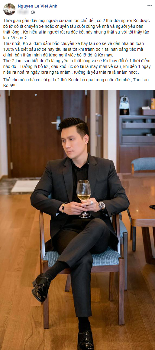 Việt Anh viết trên trang cá nhân: "Thời gian gần đây mọi người cứ râm ran chủ đề, có 2 thứ đời người không được bỏ lỡ đó là chuyến xe hoặc chuyến tàu cuối cùng về nhà và người yêu bạn thật lòng. Không hiểu ai là người rút ra đúc kết này nhưng thật sự với tôi thấy tào lao. Vì sao?