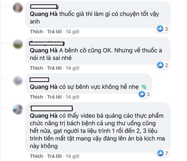 Quan điểm của Quang Hà ngay lập tức nhận về "cơn mưa" chỉ trích của netizen. Nhiều khán giả bức xúc cho rằng thuốc và thực phẩm chức năng là 2 phạm trù hoàn toàn khác nhau, việc nam ca sĩ đưa ra ý kiến như vậy là vô tình quay lưng với sức khỏe của người hâm mộ. Không ít người còn thẳng thừng mắng Quang Hà thiếu suy nghĩ vì phát ngôn vội vàng này.