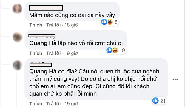 Không giống như các đồng nghiệp chỉ để lại lời an ủi mà không tỏ rõ thái độ, ca sĩ Quang Hà lại có ý kiến đi ngược lại số đông: "Đối với người này là tốt, với người khác lại là chưa đủ. Thuốc hay thực phẩm chức năng hay sản phẩm gì đi chăng nữa thì cũng tùy hợp với cơ địa của từng người. Mãi yêu chị Hồng Vân. Cố lên chị yêu!".
