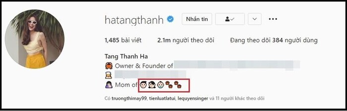 Kể từ sau khi công bố thông tin đã làm mẹ lần 3, Tăng Thanh Hà vẫn luôn giấu kín gương mặt và giới tính của bé, không tiết lộ gì thêm. Tuy vậy, các "thánh soi" lại vừa phát hiện được điểm đặc biệt trên Instagram của nữ diễn viên. Cụ thể, trong phần giới thiệu và mô tả, Hà Tăng đã thêm dòng chú thích "là mẹ của 3 bé", kèm 3 biểu tượng gương mặt trẻ em được xếp lần lượt là trai - gái - trai.