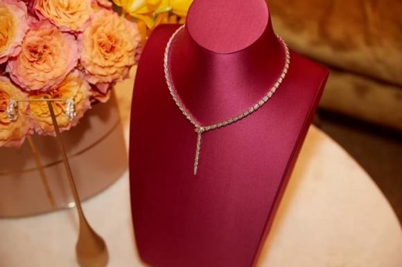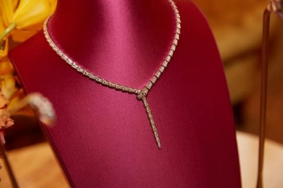 Bên cạnh đó, vòng cổ và bông tai hình rắn Serpenti đính full kim cương cũng là những món nữ trang đặc trưng của Bvlgari được Minh Hằng chọn đeo trong màn biểu diễn trên sân khấu tiết mục first dance. Đây là bộ trang sức đỉnh cao về nghề kim hoàn của Ý với kỹ thuật chạm khắc thủ công từng hạt kim cương tự nhiên trên mỗi lớp vảy rắn, tạo ra sự uyển chuyển và linh động theo bừng nhảy của cô dâu. Bộ trang sức mang ý nghĩa của sự tái sinh, sự quyến rũ và nữ quyền - cũng giống như vẻ đẹp và nét cá tính mà chú rể vốn bị thu hút từ cái nhìn đâu tiên bởi cô dâu của mình.