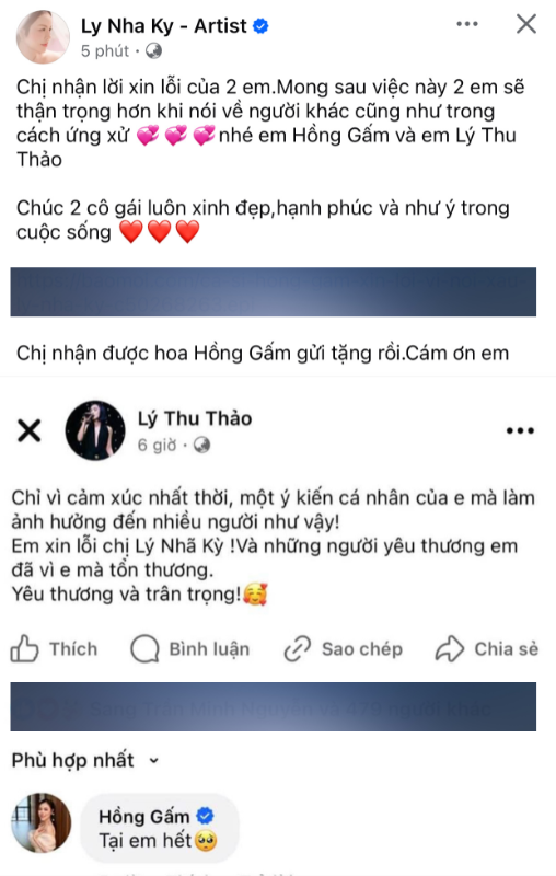 Không lâu sau bài đăng của Lý Thu Thảo, Lý Nhã Kỳ đã chia sẻ lại và cho biết chấp nhận lời xin lỗi từ cả hai. "Chị nhận lời xin lỗi của 2 em. Mong sau việc này 2 em sẽ thận trọng hơn khi nói về người khác cũng như trong cách ứng xử nhé em Hồng Gấm và em Lý Thu Thảo. Chúc 2 cô gái luôn xinh đẹp, hạnh phúc và như ý trong cuộc sống", Lý Nhã Kỳ chia sẻ.