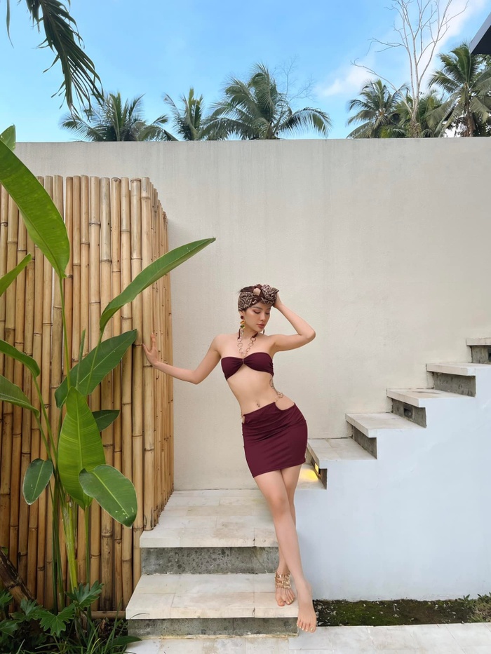 Mới đây, trên trang cá nhân, Phương Trinh Jolie đăng tải loạt ảnh diện bikini mới trong kì nghỉ tại Bali. Người đẹp lựa chọn bộ bikini màu đỏ mận kết hợp cùng khăn turban mang đến sự sành điệu, sang chảnh, đồng thời giúp cô khoe trọn 3 vòng cực kì nóng bỏng. Nữ diễn viên còn khoe khéo được cả hình xăm ở vị trí gợi cảm.