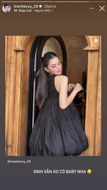 Tiểu Vy đã chia sẻ một số hình ảnh "lên đồ" đi ăn cưới Phương Lan và Phan Đạt. Cô chủ động đăng lại bài viết mới nhất trên story và khẳng định: "Xinh xắn không có baby nha".