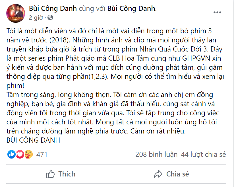 Sau vài ngày im lặng, mới đây Bùi Công Danh đã chính thức lên tiếng về sự việc: "Tôi là một diễn viên và đó chỉ là một vai diễn trong một bộ phim 3 năm về trước (2018). Những hình ảnh và clip mà mọi người thấy lan truyền khắp bữa giờ là trích từ trong phim Nhân Quả Cuộc Đời 3. Đây là một series phim mà CLB Hoa Tâm xin ý kiến và được ban hành với mục đích cúng dường phát tâm, gửi gắm thông điệp qua từng phần (1,2,3). Mọi người có thể tìm hiểu và xem lại phim!