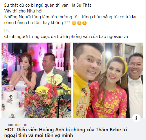 Lùm xùm tình cảm giữa diễn viên Hoàng Anh - Quỳnh Như và Thắm Bebe như chưa bao giờ hết "nóng". Mới đây, trên trang cá nhân của vợ cũ nam diễn viên chia sẻ bài đăng có tiêu đề: "Diễn viên Hoàng Anh bị chồng của Thắm Bebe ngoại tình và mới tiền vợ".
