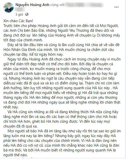 Đây sẽ là lần đầu tiên và cũng là lần cuối cùng Hoàng Anh chia sẻ về vấn đề hôn nhân gia đình của mình. Và Hoàng Anh muốn chúng ta chấm dứt câu chuyện tại đây, kể từ ngày hôm nay.