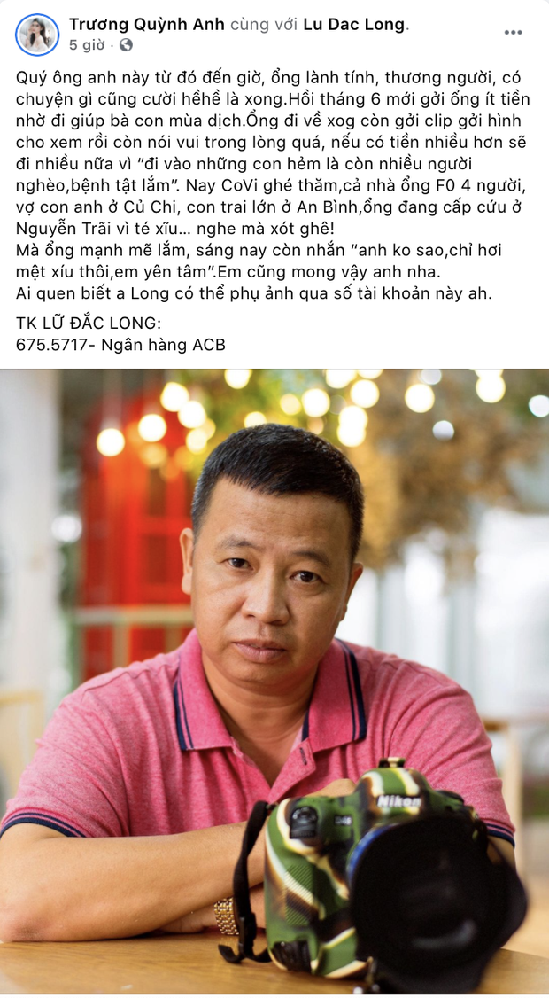 14/07/2021 01:34Diễn viên Lữ Đắc Long phải thở máy, cả gia đình 4 người nhiễm Covid-19, Trương Quỳnh Anh và dàn sao đồng loạt kêu gọi ủng hộ