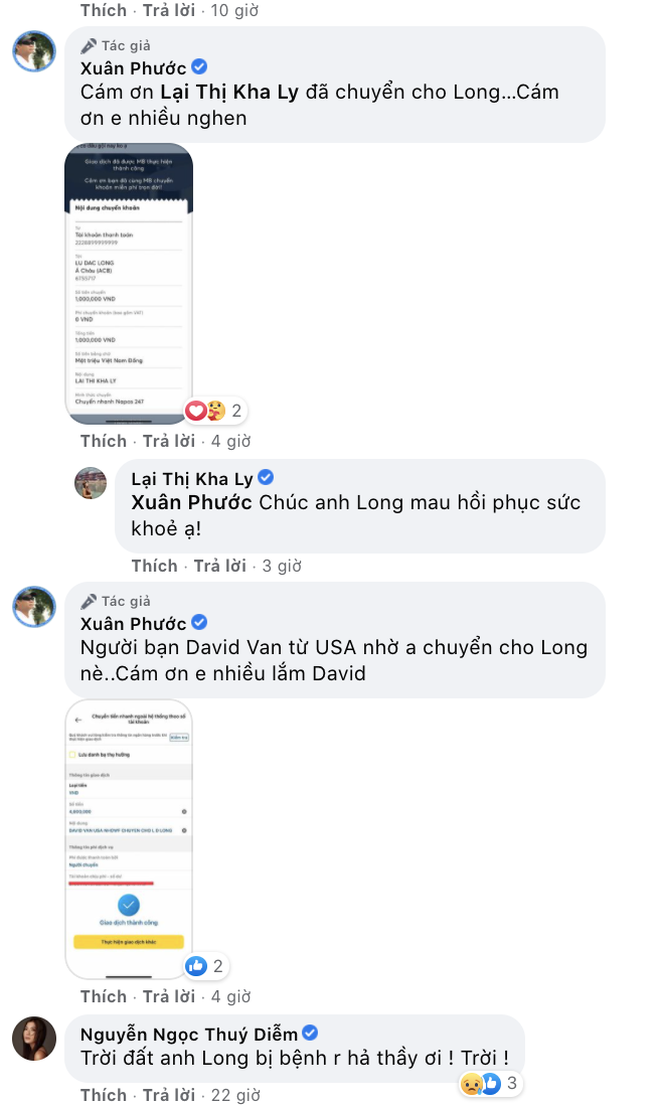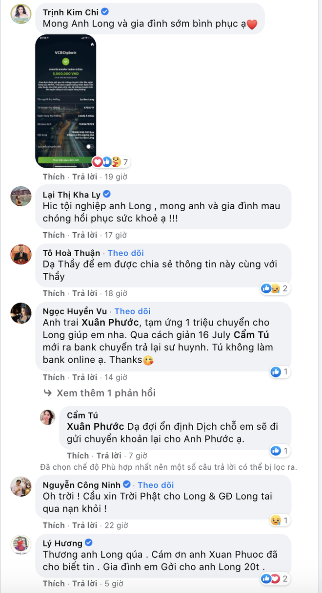 Đáng chú ý hơn cả, trước đó, diễn viên Lữ Đắc Long có nhắn cho vài người bạn nhằm chia sẻ về tình hình khó khăn của gia đình vì không có thu nhập suốt vài tháng. Ngay lập tức, rất nhiều nghệ sĩ đã đăng tải bài viết trên trang cá nhân nhằm kêu gọi hỗ trợ cho gia đình của Lữ Đắc Long.