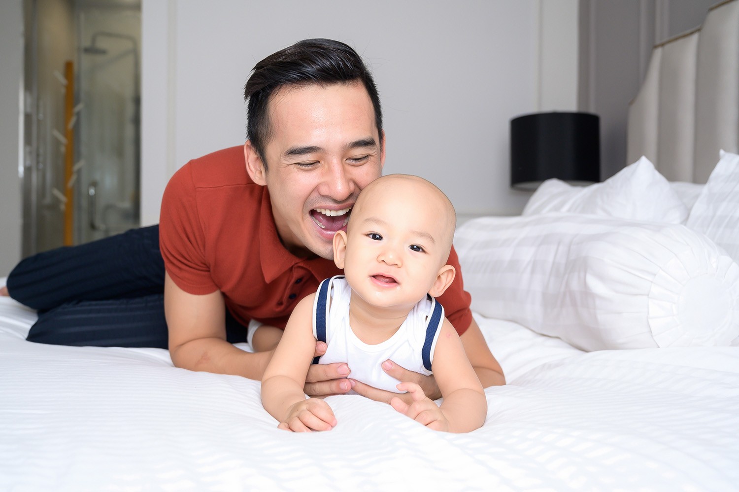 May mắn, tôi có ba mẹ phụ giúp. Từ lúc sinh bé cho đến giờ, ông bà nội lên sống chung, chăm sóc cho bé. Nhờ có ông bà nội, chúng tôi mới đi phim, đi làm được. Nếu không có ông bà nội, chúng tôi chắc không thể nào duy trì được công việc liên tục.