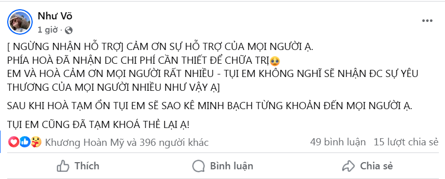 Trên trang cá nhân, người quản lý viết: "Ngừng nhận hỗ trợ. Cảm ơn sự hỗ trợ của mọi người ạ. Phía Hòa đã nhận đủ chi phí cần thiết để chữa trị".
