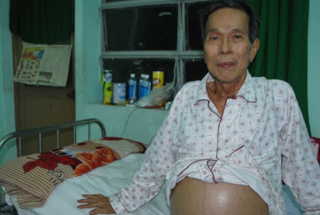 | Diễn viên Thành Lũy và chiếc bụng phình to vì xơ gan cổ trướng. |