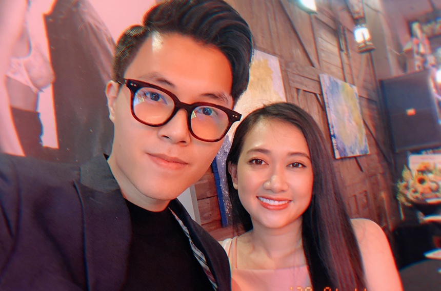 “Hồi xưa, bạn ấy làm ở casino. Tình cờ, bạn ấy được tặng vé xem kịch bên sân khấu Thế giới trẻ. Sau khi sang sân khấu kịch và xem tôi diễn, bạn ấy đã bật khóc và nán lại sân khấu đến phút chót. Bạn đã đến làm quen, sau đó về nhắn tin tôi trên Facebook. Ngày xưa, tôi có thói quen hay kiểm tra tin nhắn chờ vì còn bán hàng online. Khi phát hiện tin nhắn và xem ảnh của bạn, tôi thấy đây là anh chàng đúng gu của mình và bắt đầu tìm hiểu”.