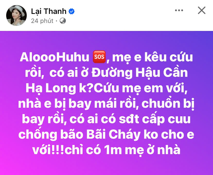 Nữ diễn viên viết: "Mẹ em kêu cứu rồi, có ai ở đường Hậu Cần Hạ Long không cứu mẹ em với. Nhà em bị bay mái rồi, có ai có số điện thoại cấp cứu chống bão Bãi Cháy không cho em với. Chỉ có một mình mẹ ở nhà".