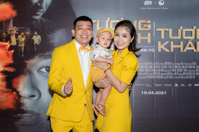 Thanh Tân mặc ton-sur-ton vàng bên vợ và con trai 1 tuổi. Nam diễn viên sinh năm 1989 từng được khán giả biết đến qua nhiều phim như: Lật mặt, Cua lại vợ bầu, Chị Mười Ba - Phần kết Thập Tam Muội, Chị Mười Ba - 3 ngày sinh tử và Bố Già.