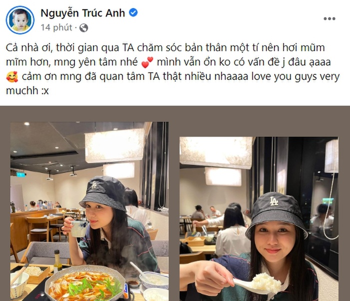 Trước tin đồn này, mới đây trên trang cá nhân, diễn viên Trúc Anh đã chính thức lên tiếng. Cô nàng cho biết: "Cả nhà ơi, thời gian qua Trúc Anh chăm sóc bản thân một tí nên hơi mũm mĩm hơn, mọi người yên tâm nhé, mình vẫn ổn không có vấn đề gì đâu ạ. Cảm ơn mọi người đã quan tâm Trúc Anh thật nhiều nha, love you guys very much (tạm dịch: yêu mọi người rất nhiều)".