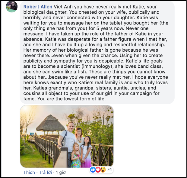 Không những vậy, người chồng hiện tại của vợ cũ Việt Anh cũng để lại lời nhắn tố Việt Anh giả tạo. Người này cho biết nam diễn viên "Người phán xử" lừa dối vợ cũ, không bao giờ liên lạc với con gái trong suốt 10 năm: "Her memory of her biological father is gone because he was never there, even when given the chance. Using her to create publicity and sympathy for you is despicable. Katie's life goals are to become a scientist (immunology), she loves band class, and she can swim like a fish. These are things you cannot know about her... because you've never really met her. I hope everyone here knows exactly who Katie's real family is and who truly loves her. Katies grandma's, grandpa, sisters, auntie, uncles, and cousins all object to your use of our girl in your campaign for fame. You are the lowest form of life".