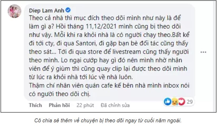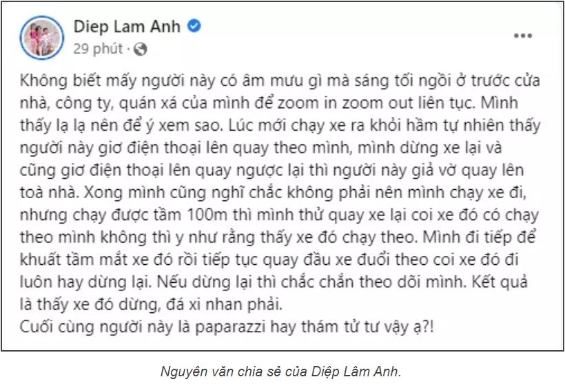 Tối 13/9, Diệp Lâm Anh có bài đăng khá dài trên mạng xã hội, tiết lộ việc bị người lạ theo dõi.