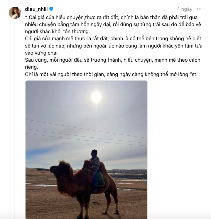 Giữa lúc dư luận xôn xao, Diệu Nhi bất ngờ có động thái gây chú ý vào tối 12/8. Theo đó, nữ diễn viên đã chia sẻ khoảnh khắc hẹn hò, nắm chặt tay Anh Tú để chứng minh cả hai vẫn đang gắn bó và hạnh phúc. Đồng thời, Diệu Nhi cũng cho biết trang cá nhân kia chỉ dùng để chia sẻ với khán giả những câu nói hay mà cô đọc được.