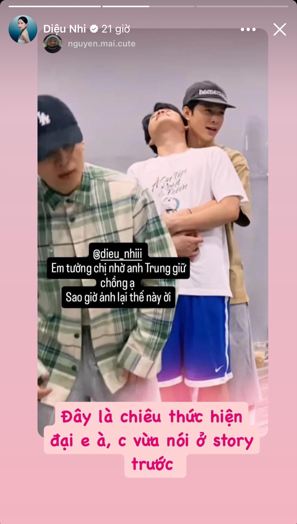 Trên trang cá nhân, Diệu Nhi chia sẻ lại những hình ảnh thân thiết giữa Quang Trung và Anh Tú. Đính kèm là loạt status "nhắc nhở nhẹ" Quang Trung như: "Có phải đây là chiêu điệu hổ ly sơn không em? Lấy thân mình ra cam chịu, đánh lạc hướng để người khác thấy em là né không dám đến gần chồng chị nữa. Chị cảm ơn bé 3 rất nhiều, đúng là khổ nhục kế, quá thông minh".