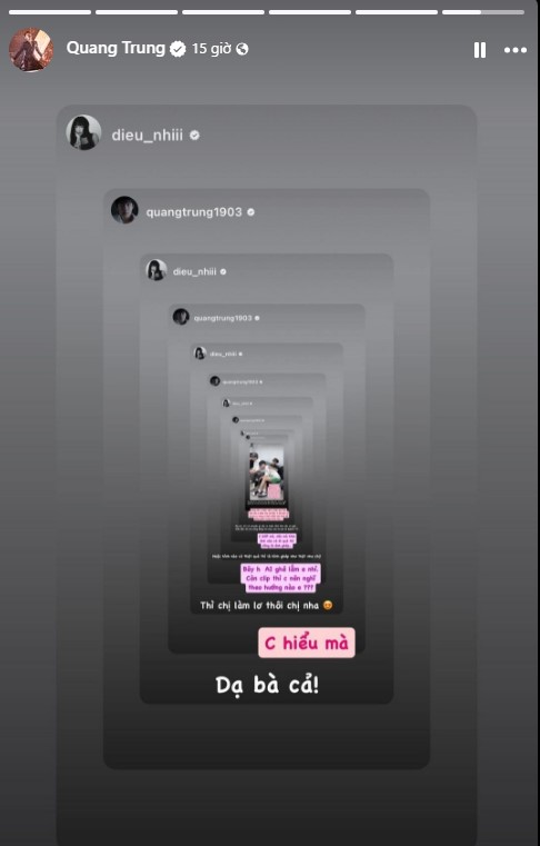 Không phải dạng vừa, Quang Trung sau khi bị nhắc tên cũng đăng đàn đối đáp 1:1 với Diệu Nhi. Cả hai không nhắn tin riêng mà công khai nhắn nhủ đối phương khiến cư dân mạng cười muốn nội thương. Cái kết cho màn "đánh ghen bất đắc dĩ" này là việc Quang Trung thừa nhận Diệu Nhi vẫn là "bà cả" trong nhà. Cư dân mạng hài hước bình luận rôm rả, kèm theo đó là sự đồng cảm với Diệu Nhi khi lúc nào cũng phải "canh chừng" chồng trước "bé 3" Quang Trung.