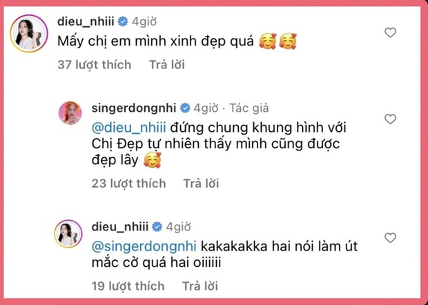 Phía dưới phần bình luận, Đông Nhi và Diệu Nhi còn tương tác thân thiết qua lại hậu tin đồn rạn nứt tình cảm. Nữ diễn viên sinh năm 1991 dành lời khen ngợi: "Mấy chị em mình xinh đẹp quá". Trước bình luận của người em, Đông Nhi còn trêu đùa: "Đứng chung khung hình với 'Chị đẹp' tự nhiên thấy mình cũng được đẹp lây". Diệu Nhi còn thể hiện mối quan hệ thân thiết với nữ ca sĩ khi gọi Đông Nhi là "hai" và xưng "út".