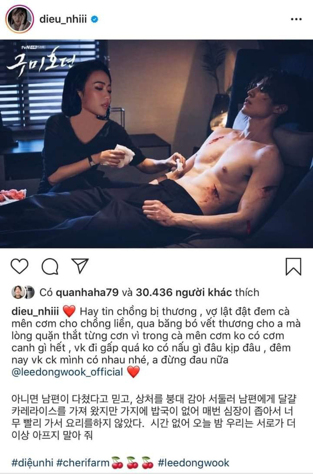Tối ngày 27/10, Diệu Nhi lầy lội chia sẻ khoảnh khắc "chụp chung" bên cạnh Lee Dong Wook đầy nóng bỏng, thậm chí công khai "gọi chồng xưng vợ" đầy tình cảm. Tuy nhiên, đây chỉ là ảnh ghép do chính cô nàng thực hiện. Diệu Nhi đã tự biến mình thành nữ chính phim Bạn Trai Tôi là Hồ Ly để có cơ hội chăm sóc vết thương của Lee Dong Wook.