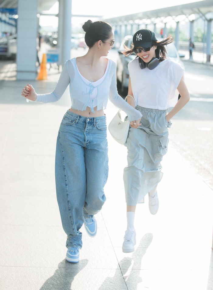 Nữ diễn viên còn hài hước nói thêm: "Sáng hai chị em tưởng trễ giờ nên chạy vội ra sân bay quá, đi đâu hỏi chỉ nha tại chỉ chưa cho mình nói". Trong khung hình hai người đẹp đều diện trang phục đơn giản, năng động.