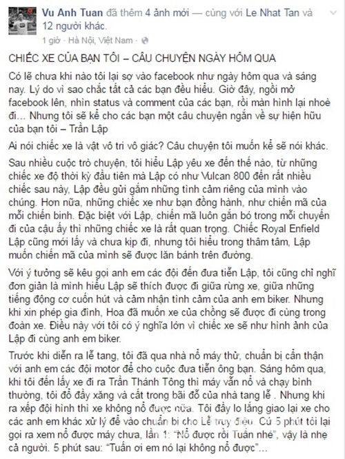 MC Anh Tuấn đã đổ đầy xăng, chạy thử và kiểm tra cẩn thận chiếc 'chiến mã' của Trần Lập. Tuy nhiên, trước khi ra xếp đội hình để tiễn đưa Trần Lập thì xe không nổ máy. Ngay sau đó, Anh Tuấn đã nhìn di ảnh của Trần Lập và âm thầm nói: "Ông ơi, anh em ở đây hết để đi tiễn ông, ông về nổ máy cái xe để đi cùng anh em đi, đừng ở lại…". Và điều kỳ diệu đã xảy ra sau lời cầu khấn của Anh Tuấn, chiếc xe nổ máy. Anh Tuấn cho rằng chiếc xe motor không phải vô tri, vô giác. Chiếc xe hiện hữu hình ảnh, và linh hồn của Trần Lập.