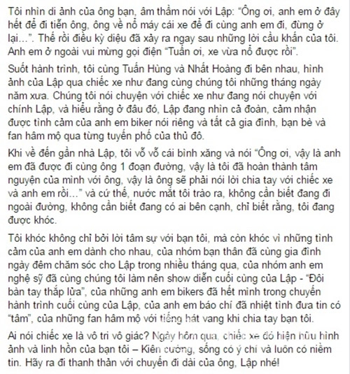 Để chuẩn bị cho đám tang của Trần Lập, MC Anh Tuấn đã đưa ra ý định tiễn đưa nhạc sĩ về nơi an nghỉ cuối cùng bằng tiếng nổ vang của xe motor. Sau đó, vợ Trần Lập đã đề nghị để chiếc xe của nhạc sĩ cùng đi với motor của các anh em.