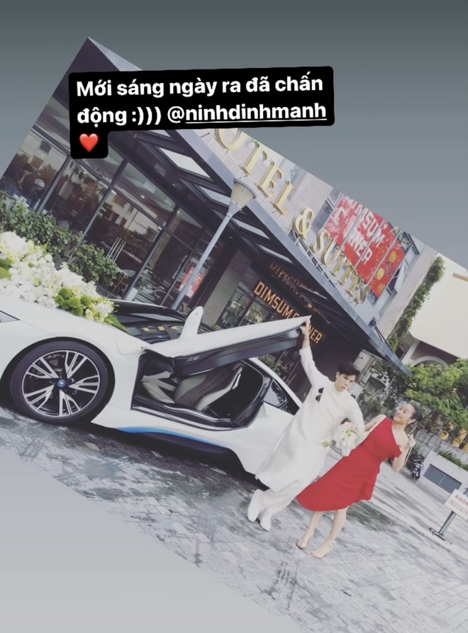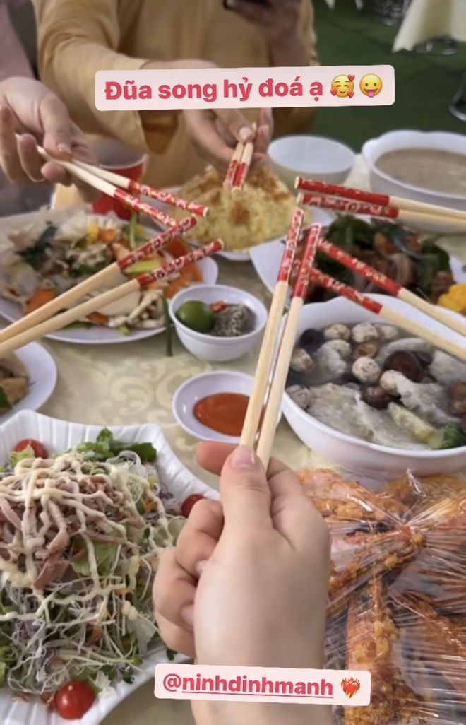 Kèm theo đó, nam ca sĩ 8x viết: "Đẹp ngày". Ngày vui của cặp đôi có họ hàng, bạn bè thân thiết tham dự. Trên trang cá nhân, MC Phí Linh chia sẻ khoảnh khắc tham gia ngày vui của cả hai. Bà xã của Đinh Mạnh Ninh có gương mặt xinh xắn, ưa nhìn.