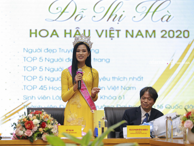 Chia sẻ tại buổi gặp mặt Tân Hoa hậu Việt Nam trong lần đầu trở lại trường sau khi đăng quang, ông Phạm Hồng Chương - Hiệu trưởng trường Đại học Kinh tế Quốc dân cho biết: "Trong 2 năm tới, Hà không chỉ phải hoàn thành nghĩa vụ xã hội mà còn cần hoàn thành tốt việc học tập, như các đàn chị đi trước. Thời gian sắp tới thay mặt nhà trường đề nghị các tổ chức đoàn thể cũng như bạn bè sẽ luôn ủng hộ Hà hoàn thành nghĩa vụ xã hội, đồng thời là việc học tập. Trong thời gian tới Hà phải hoàn thành nhiều việc nên đề nghị mọi người hỗ trợ để bạn có thể hoàn thành xuất sắc việc học tập. Bây giờ tập thể trường Đại học Kinh tế Quốc dân không chỉ tự hào việc học giỏi, kinh doanh giỏi mà cũng rất đẹp và duyên dáng".