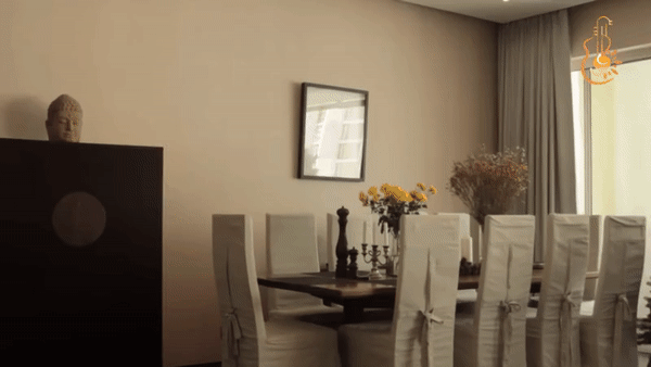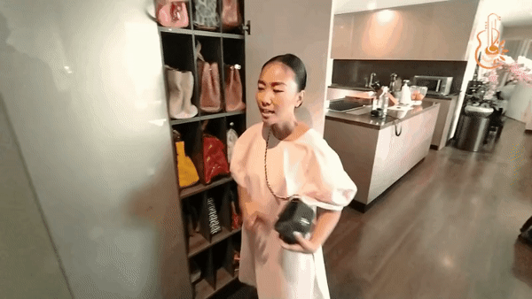 Khu vực phòng khách, bếp và bàn ăn thông nhau và được bố trí chung trong gian đầu của nhà. Ngoài ra, một căn phòng không thể thiếu của các nghệ sĩ chính là nơi có tủ đồ hiệu. Nữ ca sĩ dành một góc riêng để trưng bày các phụ kiện thời trang, những chiếc túi đầy màu sắc, kiểu dáng đến từ những thương hiệu khác nhau mà cô yêu thích. Với phong cách làm nhà tối giản nên tủ đồ hiệu cũng được thiết kế âm tường và chia thành nhiều ngăn nhỏ.
