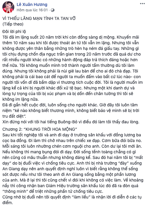 Bức xúc vì chuyện này, NS Xuân Hương quyết định đáp trả. Trên trang cá nhân của mình, NS Xuân Hương có đề cập bóng gió về giới tính của chồng cũ: "Cái máu lãng mạn không bao giờ ngừng chảy trong anh. Anh luôn tạo những bất ngờ trong mọi tình huống. Thí dụ như nhiều khi nửa đêm thay vì ngủ, anh kiếm chuyện gây lộn để tránh chuyện chăn gối với tôi. Gây đến khi anh đuối lý thì anh có nhiều cách giải quyết mâu thuẫn rất lãng mạn: anh đổ nước ra sàn nhà rồi nằm giãy giụa như con gì đang tắm bùn vậy".