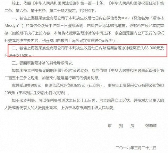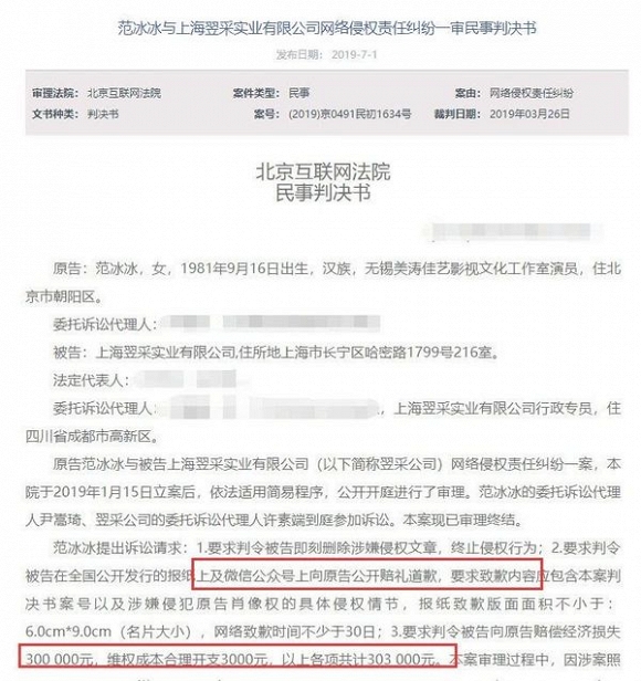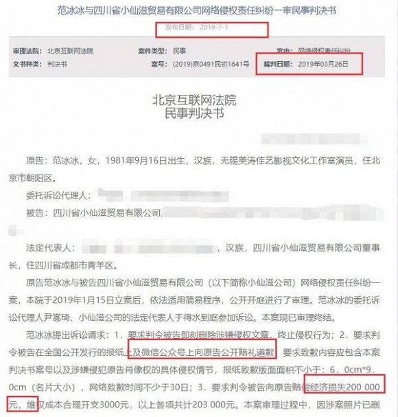 Ngày 1/7 vừa qua, Thẩm phán pháp viện Bắc Kinh đã đưa ra phán quyết dành cho hai bản án dân sự với nguyên đơn là Phạm Băng Băng. Nữ diễn viên cho biết cô bị xâm phạm quyền chân dung và hình ảnh bị lạm dụng nặng nề với mục đích quảng cáo, kiếm lợi nhuận. Việc này đã gây ảnh hưởng không nhỏ đến hình ảnh của Phạm Gia nên cô đã yêu cầu bị cáo công khai xin lỗi và bồi thường tổn thất bằng kinh tế.