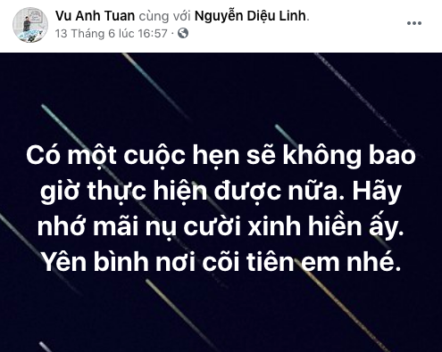 MC Anh Tuấn tiếc nuối viết lên trang cá nhân: "Có một cuộc hẹn sẽ không bao giờ thực hiện được nữa. Hãy nhớ mãi nụ cười xinh hiền ấy. Yên bình nơi cõi tiên em nhé".