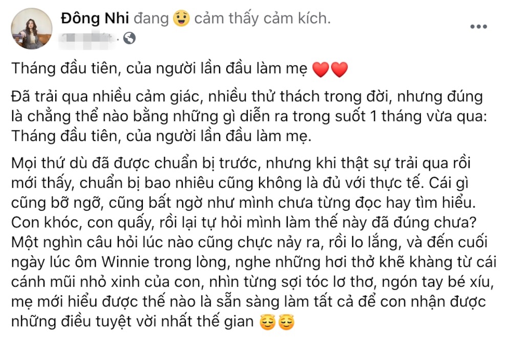 Đông Nhi viết: "Đến cuối ngày lúc ôm Winnie trong lòng, nghe những hơi thở khẽ khàng từ cái cánh mũi nhỏ xinh của con, nhìn từng sợi tóc lơ thơ, ngón tay bé xíu, mẹ mới hiểu được thế nào là sẵn sàng làm tất cả để con nhận được những điều tuyệt vời nhất thế gian".