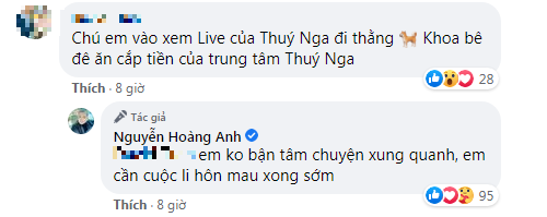 Giữa những ồn ào ly hôn của nam diễn viên "Gạo nếp gạo tẻ" thì mới đây trên trang cá nhân của danh hài Thúy Nga, cô đã thu hút sự chú ý của mọi người khi cùng 2 người bạn livestream chia sẻ về những vấn đề xoay quanh câu chuyện ly hôn của vợ chồng Hoàng Anh.