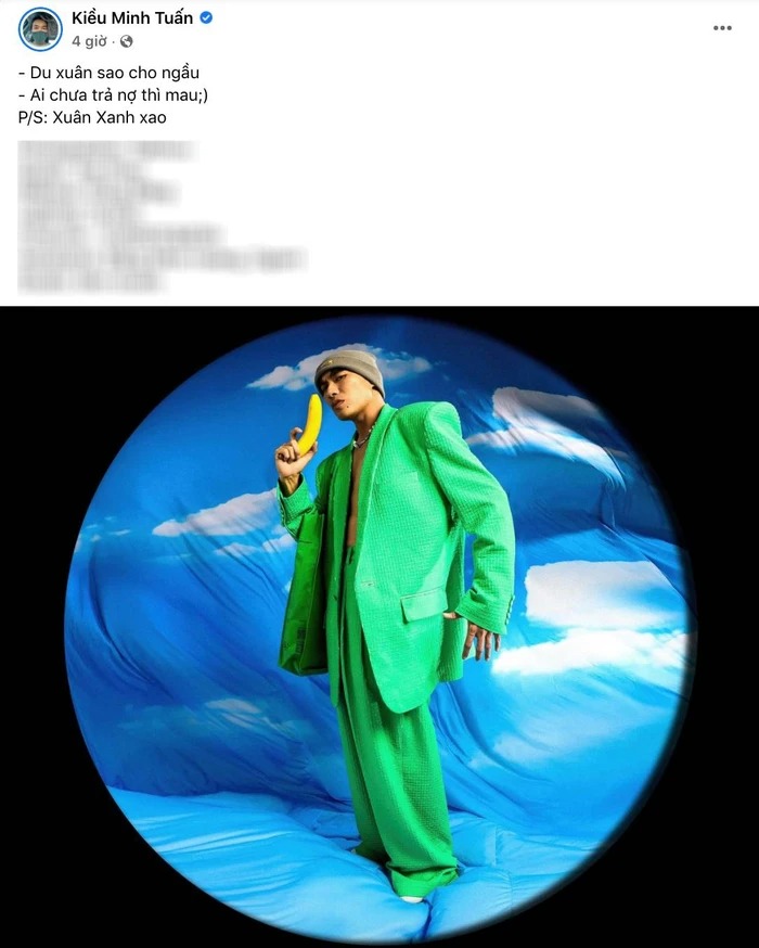 Giữa lúc cư dân mạng đang bàn tán xôn xao, bán tín bán nghi thì Kiều Minh Tuấn thoải mái chia sẻ bức ảnh mới lên trang cá nhân kèm dòng trạng thái không mấy liên quan: “Du xuân sao cho ngầu. Ai chưa trả nợ thì mau”. Có thể thấy, nam diễn viên không mấy quan tâm đến tin đồn lần này.