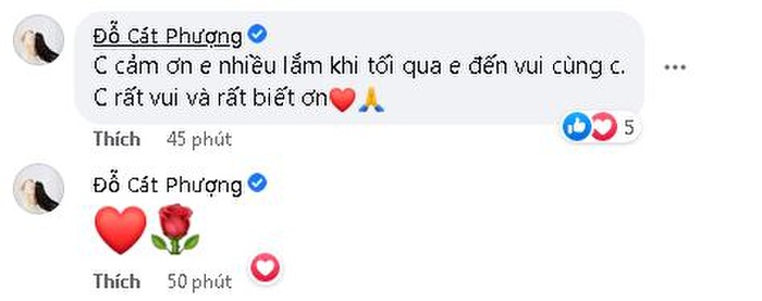 Cát Phượng đã gửi lời cảm ơn chân thành tới Lâm Vĩ Dạ: "Chị cảm ơn e nhiều lắm khi tối qua e đến vui cùng chị. Chị rất vui và rất biết ơn", ngoài ra nữ diễn viên còn gửi kèm thêm một số biểu tượng hoa hồng và trái tim. Có thể thấy nhờ sự xuất hiện của đàn em, Cát Phượng đã được xoa dịu vết thương trước vết thương lòng về việc kết thúc mối tình kéo dài hơn 10 năm.